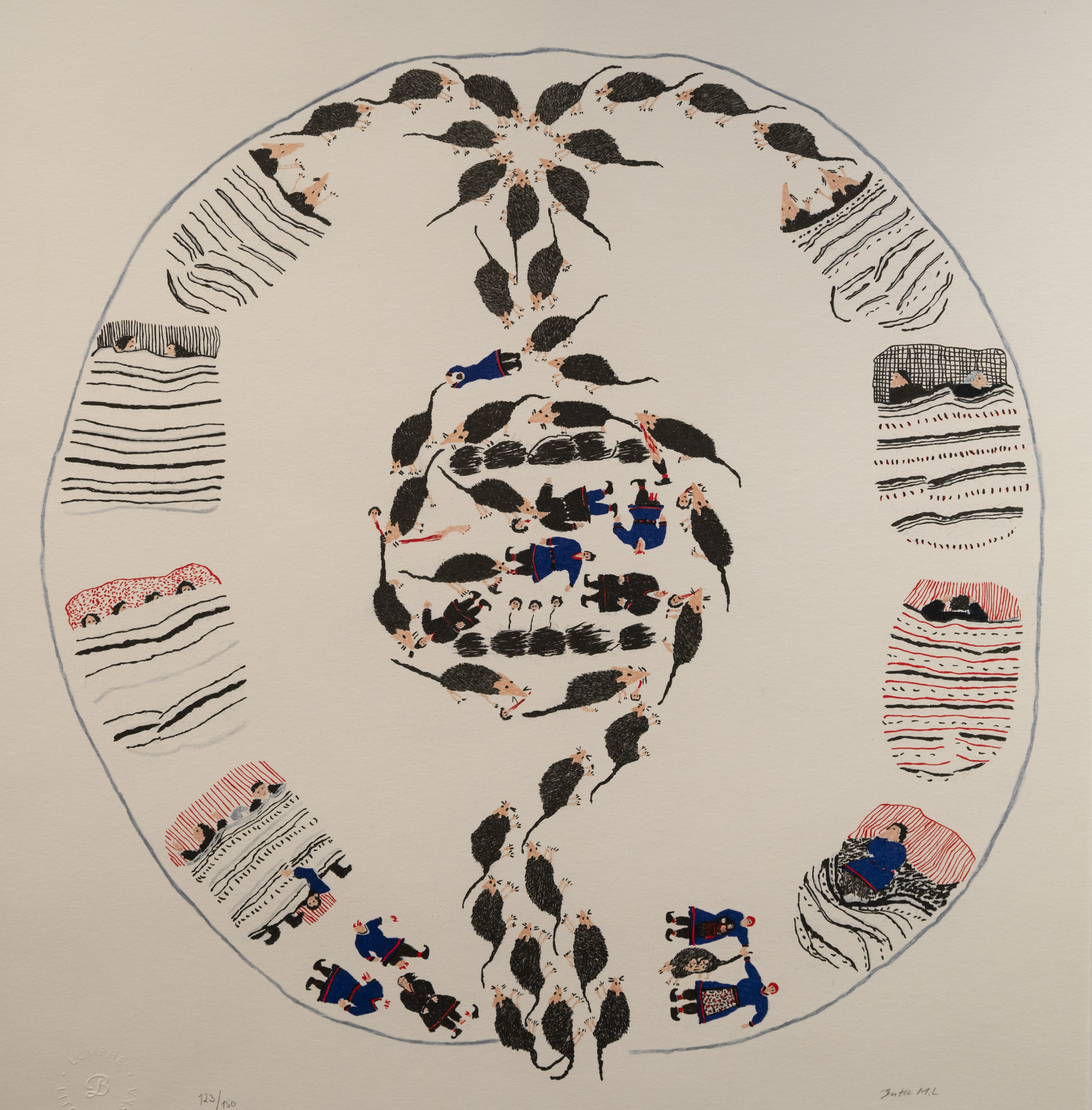 Ett återkommande motiv renar, med eller utan slädar, ett annat är figurer som bär ládjogaphir, den röda hornmössan som bars av samiska kvinnor främst i de nordsamiska och östra områdena. Den förbjöds av kyrkan under 1800-talet eftersom den ansågs vara djävulens redskap. Sedan 1990-talet har hornmössan fått en renässans, delvis tack var att den lyfts fram av Marakatt-Labba. För henne står hornmössan för styrka och självbestämmande och den bärs av de samiska gudinnorna. Randiga vävar, ranor, dyker upp i många bilder, som täcken i slädar och på bäddar samt utanpå lavvu, tältkåtor. Konturerna av nåjdtrummor, de samiska shamanernas trummor, dyker upp i ett flertal verk. Ett annat motiv är människor som gör saker tillsammans; de upplever naturen, reser i rensläde, diskuterar, förhandlar och sover. Scenerna äger nästan alltid rum utomhus, i landskap med snö men ibland också i stadsmiljö, närmare bestämt där Kiruna och LKAB-gruvan skildras. Himlen spelar en viktig roll i bilderna, ibland i form av kosmos som leder tankarna till något större, existentiellt.